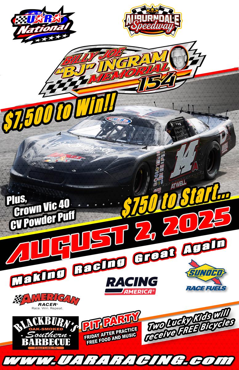 The Inaugural Billy Joe “BJ” Ingram Memorial 154 is coming to Auburndale Speedway on Saturday, August 2nd, 2025 plus Crown Vic 40 and a Crown Vic Powder Puff!